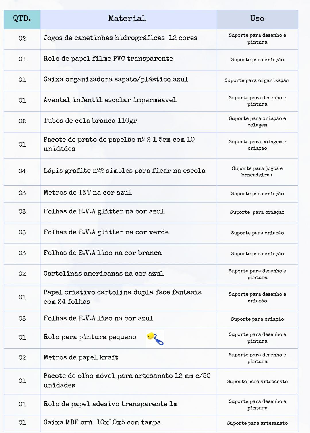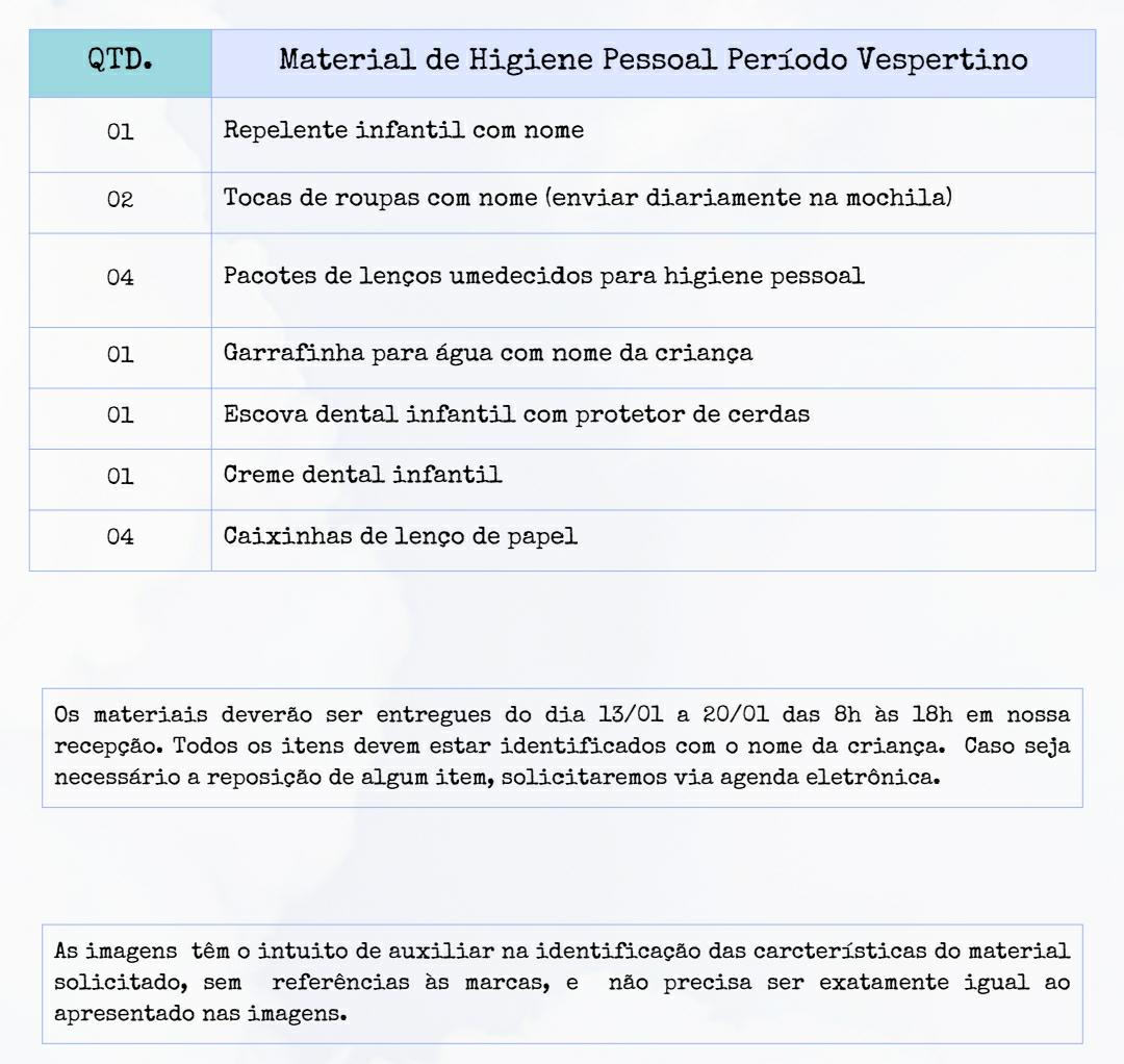 - Materiais de HIGIENE e USO PESSOAL
