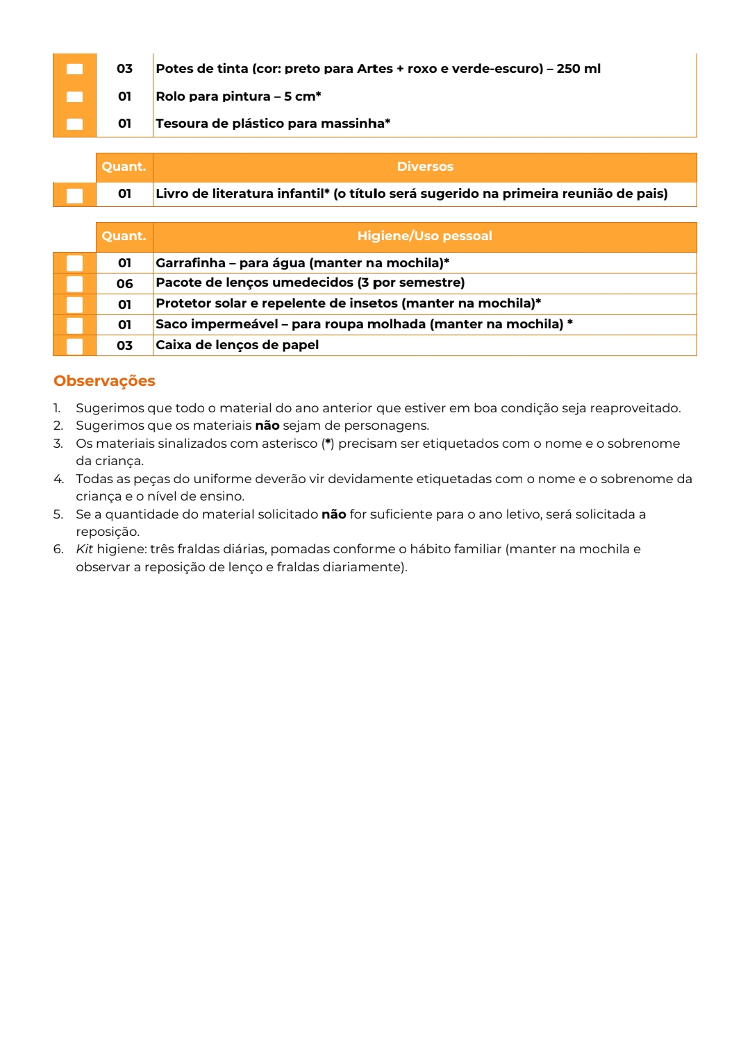 Lista Educação Infantil 2° Bilíngue / Meio período
