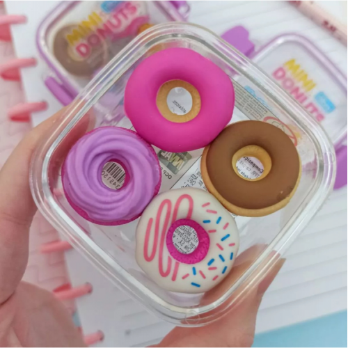 O kit vem em uma embalagem estilo lancheira e acompanha 4 mini borrachas, com coberturas removíveis que permitem montar e personalizar seus “donuts” do jeitinho que quiser.